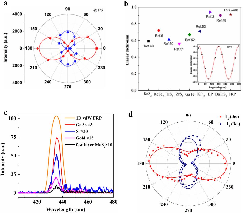 具体地,他们利用第一性原理计算发现准一维纤维状红磷在可见光谱范围内具有准平带和可观的带隙。实验上通过光致发光(PL)光谱学等测量方法,发现准一维纤维状红磷的光学反应强烈依赖于晶体的方向以及发射强度,其PL和三阶非线性光学响应中各向异性的程度可以分别达到90%和86%,与迄今为止取得的最佳性能相当。同时,他们还发现准一维纤维状红磷中巨大的发射强度,其PL和三次谐波(THG)强度分别达到了单层二硫化钼(MoS2,一种原型光致发光二维材料)的40和100倍。这一研究揭示了准一维纤维状红磷在发展具有先进功能的光学和光电器件(如,相位匹配的通信、偏振器和传感器, 极化敏感的光电探测器等)方面的潜力。