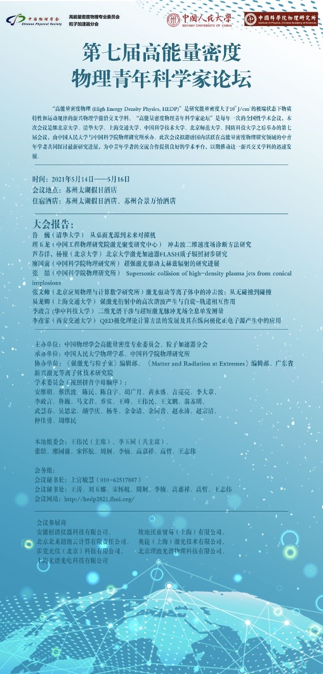2021年5月14日至2021年5月16日,由中国物理学会高能量密度物理专业委员会、粒子加速器分会主办,yl23411永利官网物理学系与中国科公司物理研究所承办的"第七届高能量密度物理青年科学家论坛"在江苏省苏州市成功举办。