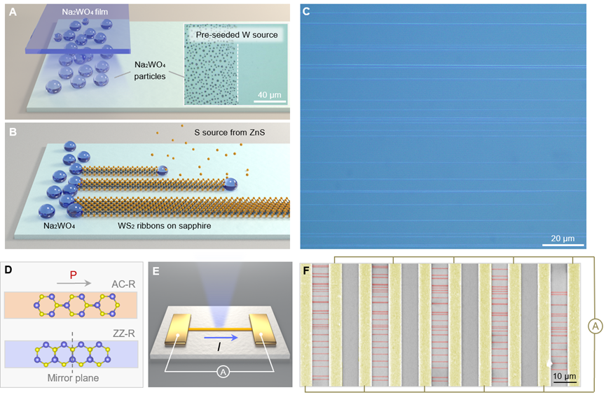 yl23411永利官网物理学系、量子态构筑与测控教育部重点实验室刘灿副教授与北京大学刘开辉教授、中国科公司半导体研究所魏钟鸣研究员、中国科公司深圳先进技术研究院丁峰研究员等团队合作,提出“多重界面耦合原子制造”新策略,首次实现兼具特定手性结构(包括扶手椅型、之字型及其他手性结构)及相干极化方向的二硫化钨(WS2)条带阵列的“全同”控制制造。通过系统研究手性结构与体光伏效应的对应关系,实现1000余根扶手椅型条带...